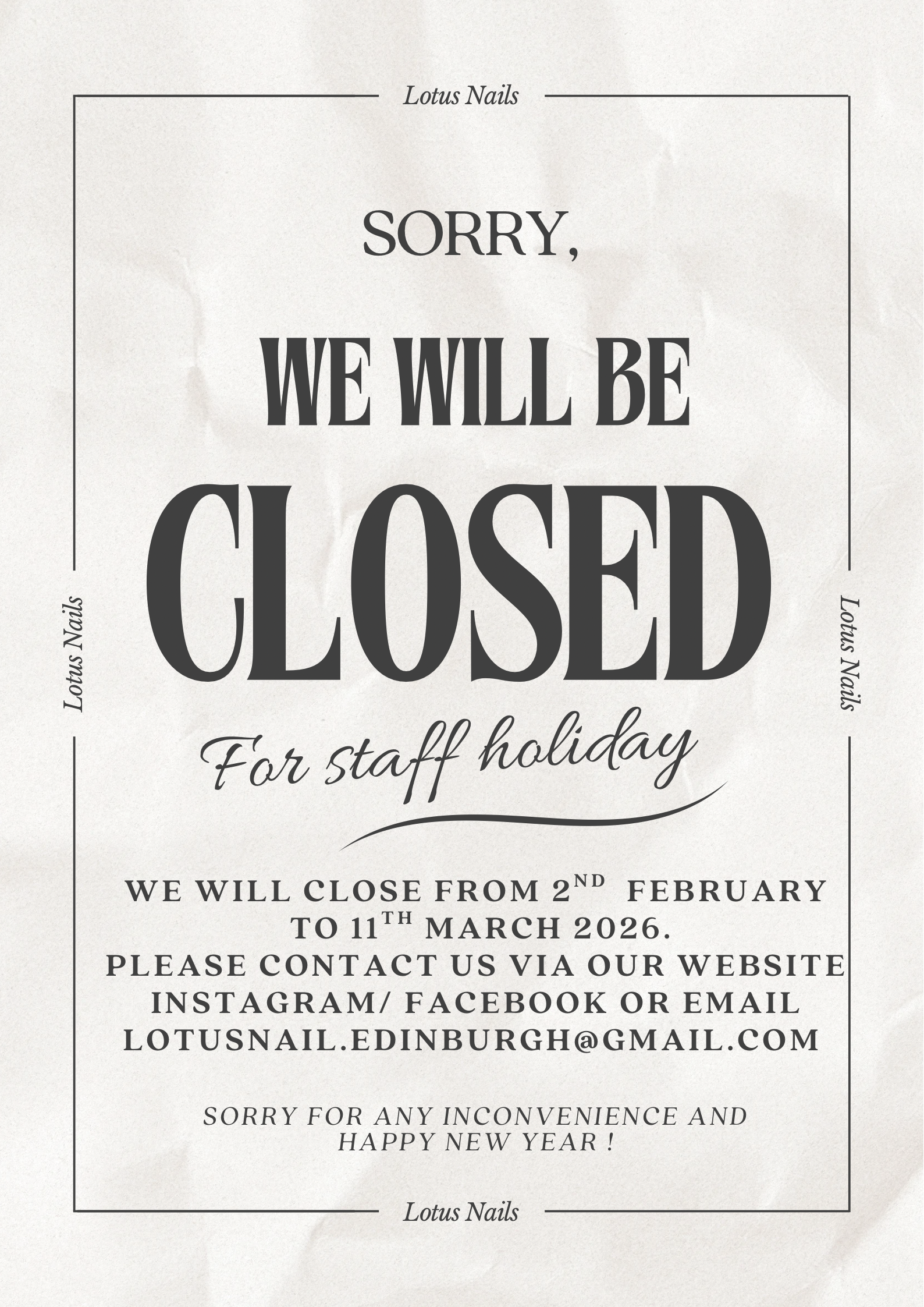 We would like to inform you that our salon will be closed from February 2nd to March 11th, 2026, for our annual staff retreat and will reopen on March 12, 2026. During this period, our phone lines and SMS services will be unavailable; however, you can still contact us through WhatsApp, Facebook, Instagram, or email, and our team will respond to your inquiries as soon as possible.We appreciate your understanding and patience during this time. If you have any urgent matters, please do not hesitate to email us, and we will make every effort to assist you promptly. Wishing you a happy and prosperous new year, and we look forward to serving you.
